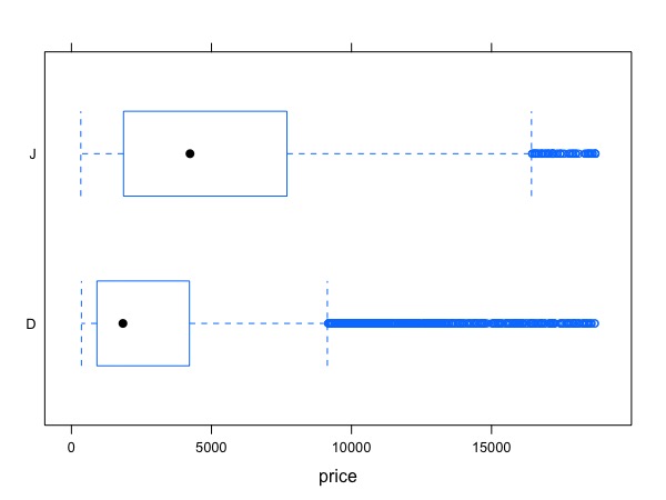 This call is an example of how the formula interface facilitates calculation of a variable's mean for each of the levels of another variable. We see that D color diamonds tend to cost less than J color diamonds.