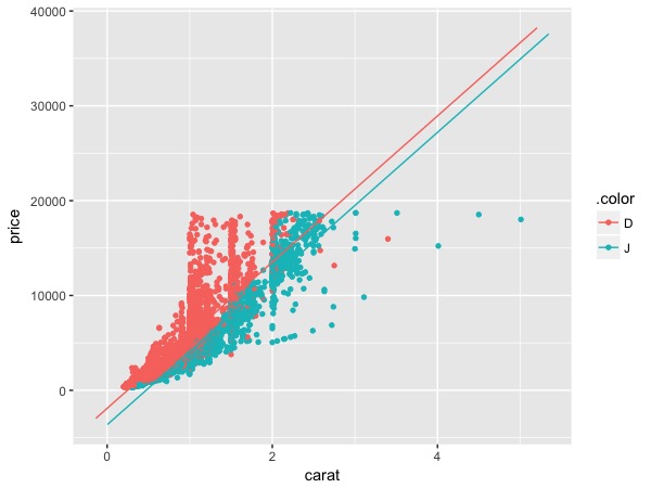 We see that controlling for the number of carats, the D color diamonds tend to sell for more than the J color diamonds. We can confirm this by fitting a regression model that controls for both variables (and then display the resulting predicted values from this parallel slopes model using plotModel()).