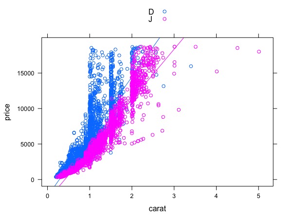 bwplot(price ~ col) t.test(price ~ col) lm(price ~ col) See the pattern? On a statistical note, it's important to remember that the diamonds were not randomized into colors: this is a found (observational dataset) so there may be other factors at play. The revised GAISE College report reiterates the importance of multivariate thinking in intro stats. Moving to three dimensions Let's continue with the "Less Volume, More Creativity" approach to bring in a third variable: the number of carats in each diamond. xyplot(price ~ carat, groups=col, auto.key=TRUE, type=c("p", "r"), data = recoded)